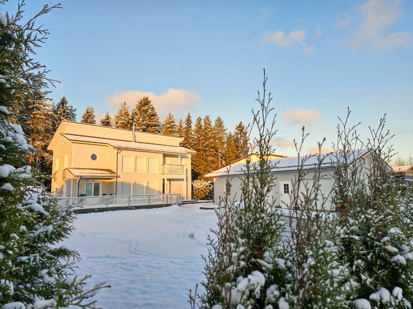 Egnahemshus | 1995/1996 | 6 r, k, wc, 2 bdr, b, hk, kr, aula, hall | 2 balkonger, terrass | Varmt förråd och garage för två bilar | Tomt 1625 m2